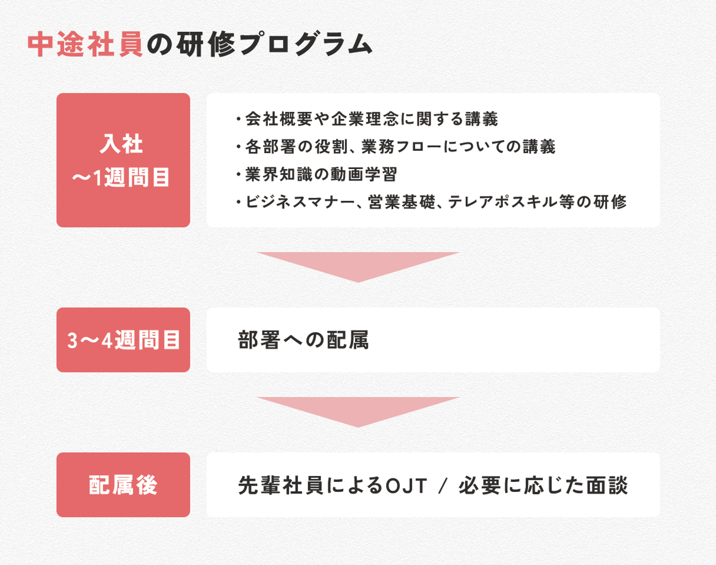 中途社員の研修プログラムは約2週間です。研修内容は実務トレーニングがメインとなっており、新卒社員と比べると研修期間は短いですが、研修後もOJTが続くため、未経験者でもしっかりスキルが身に付けられるようになっています。