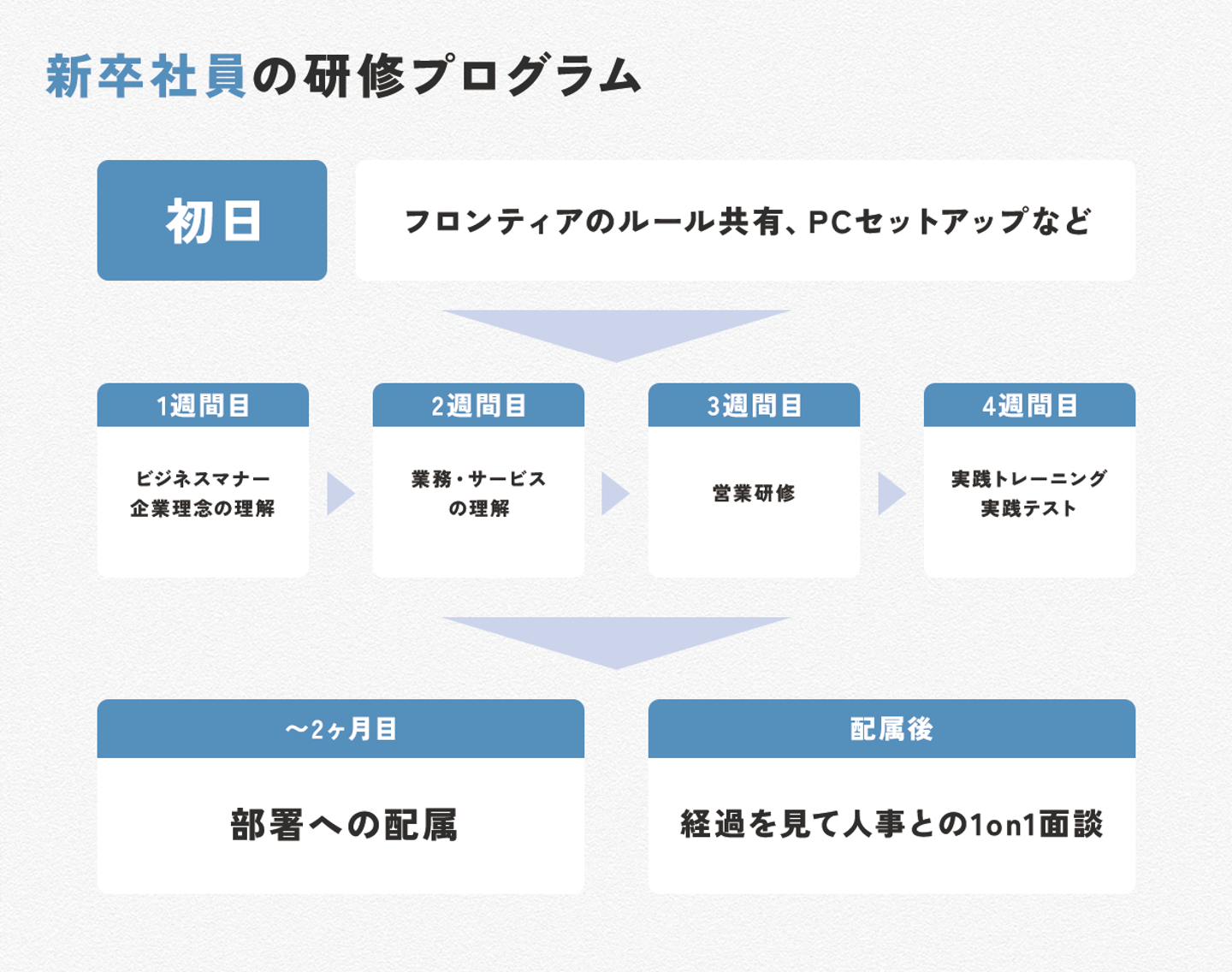 研修プログラムは、歴代のフロンティア社員がブラッシュアップを繰り返して構築した内容であり、なおかつ研修中はいつでもベテラン社員に質問できる環境なので、一人前の営業マンになるためのスキームが用意されています。