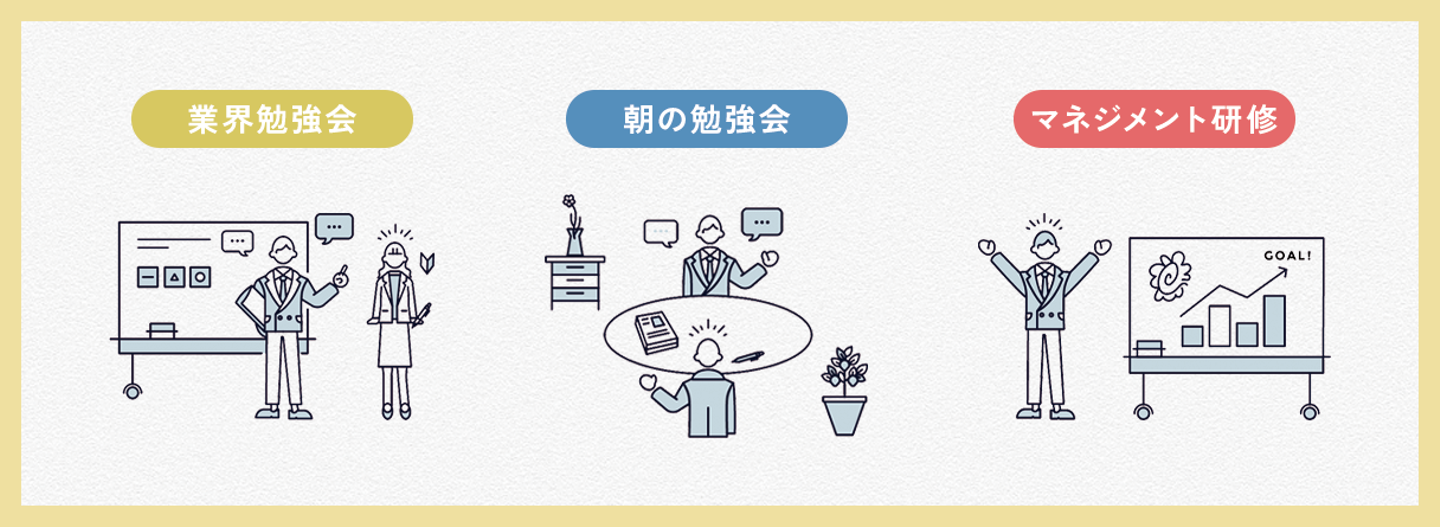 フロンティアには様々な教育制度がありますが、「業界勉強会」「朝の勉強会」「マネジメント研修」などが代表的なものですね。