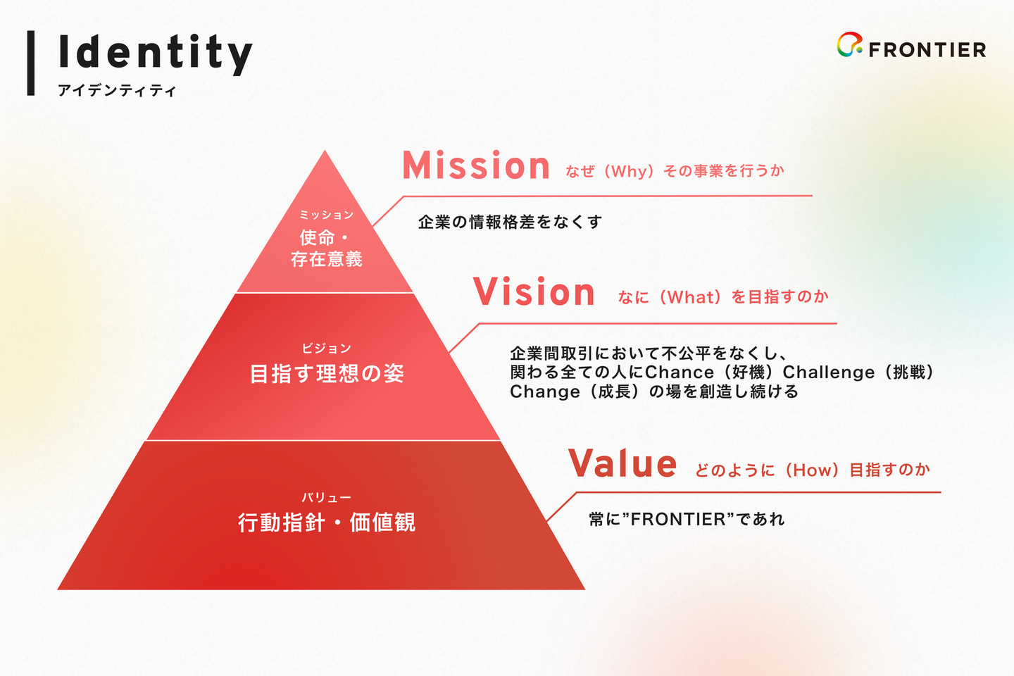 ミッションは「企業の情報格差をなくす」、ビジョンは「企業間取引において不平等性をなくし、関わるすべての人にChance・Challenge・Changeの場を創造し続けること」、バリューは「常にフロンティアであれ」。さらにコアバリューとして日々フロンティアスピリッツを大切に業務に取り組むことが示されています。