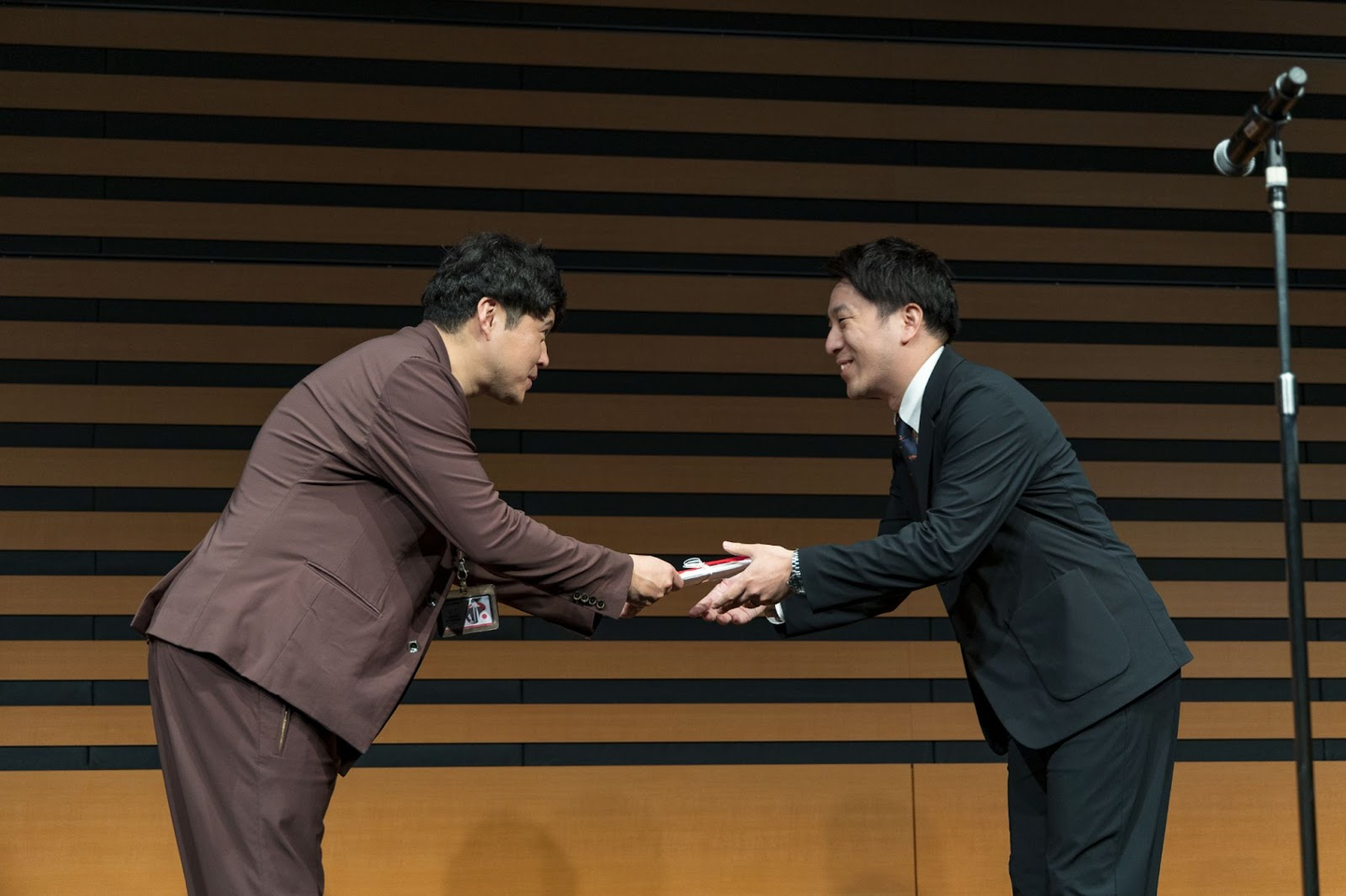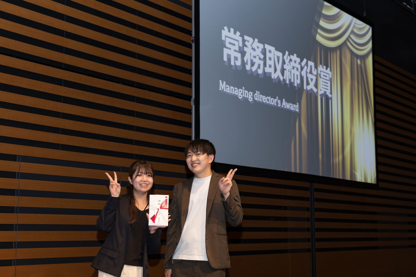 続いては、この1年間で著しい成果を上げた社員を称える表彰式と新たな役職者を任命する人事発令です。今回は本部長1名、部長8名に辞令が交付され、受賞者・昇格者はステージ上で今後の意気込みを語りました。