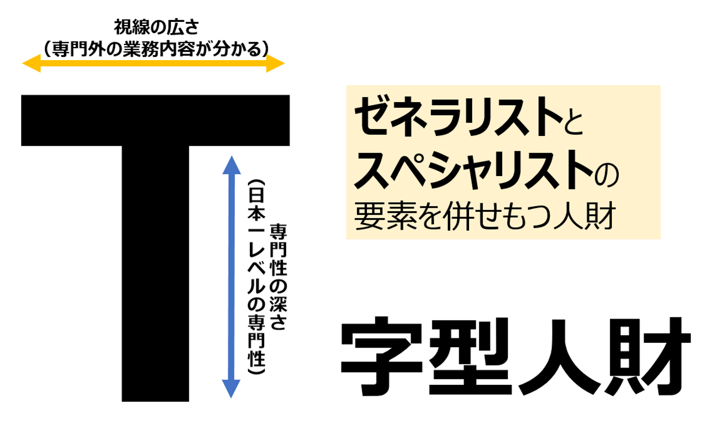 つまり、図にすると下記のような「T字型人財」が、船井総研ホールディングスに入社した新卒スタッフの育成目標になります。