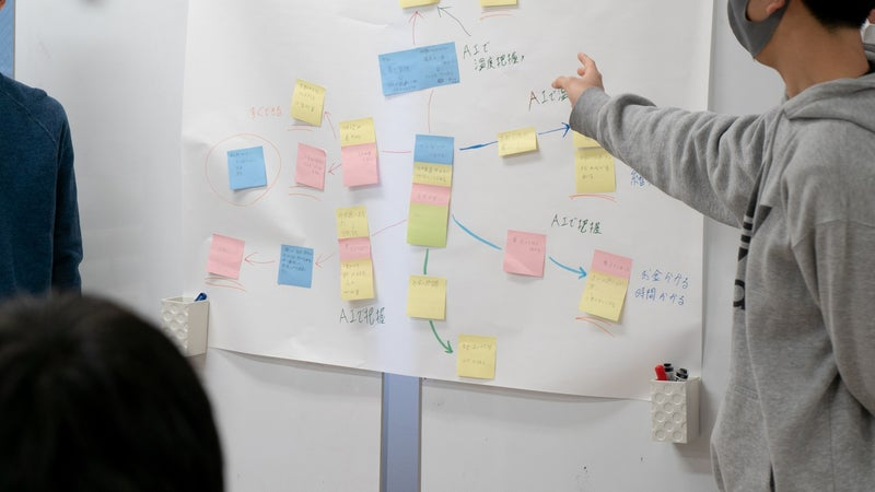 ワークを進める中で今回解決に向けて話すテーマを「冷暖房設備の改善」に絞っていったのですが、途中「AI技術で解決方法を考える」という新しいお題が追加され、「AIでできることとは」とさらに話し合いを重ねる参加者の面々。