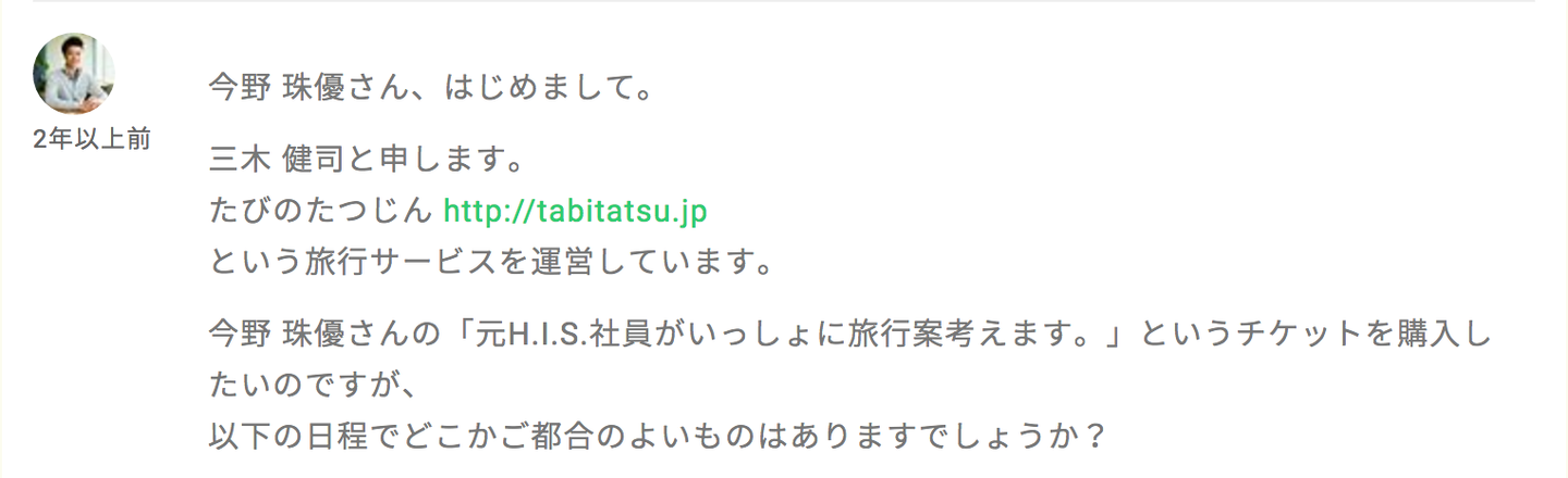 ゆとり時代、私は趣味で「元H.I.S.社員がいっしょに旅行案考えます。」というタイムチケットを出品していました。そこに購入申込をしてきたのが、株式会社Rising Asia代表・三木健司。初対面では、ざっくばらんな旅行の話から、タビタツの話までを楽しみました。率直な印象は「タビタツ超良いサービスじゃん!」でした。これ以上も以下もない位、率直にそう思いました。私もワクワクしていました。海外在住日本人を何人か紹介し「手伝える事があったら、手伝うね。」と言いその時は、別れました。