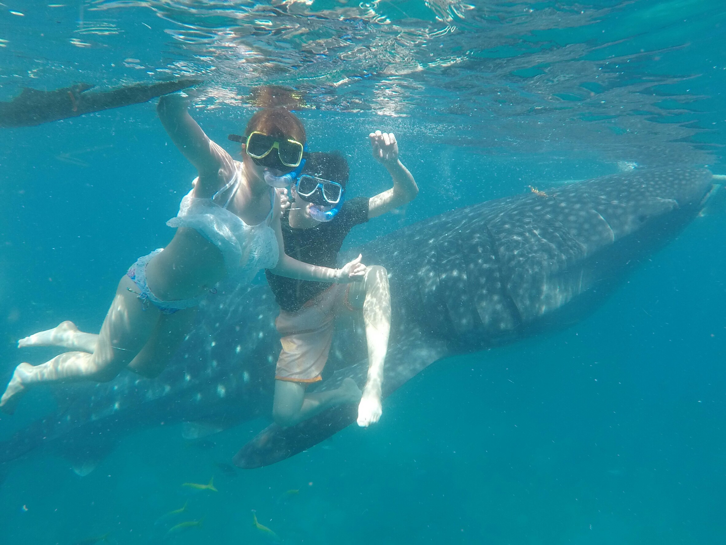 ▲セブ島1番人気ツアーにてジンベエザメと間近で泳ぐ旅行者