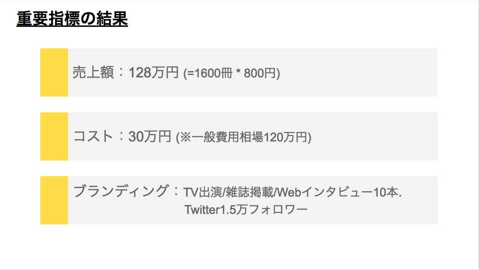 最初に設定した3つの重要指標の実際の結果から紹介。売上128万円で、コストは物理的に発生した紙代の30万円だけに抑え、約100万円の収益を手にしました。