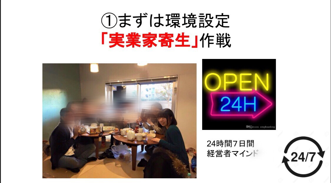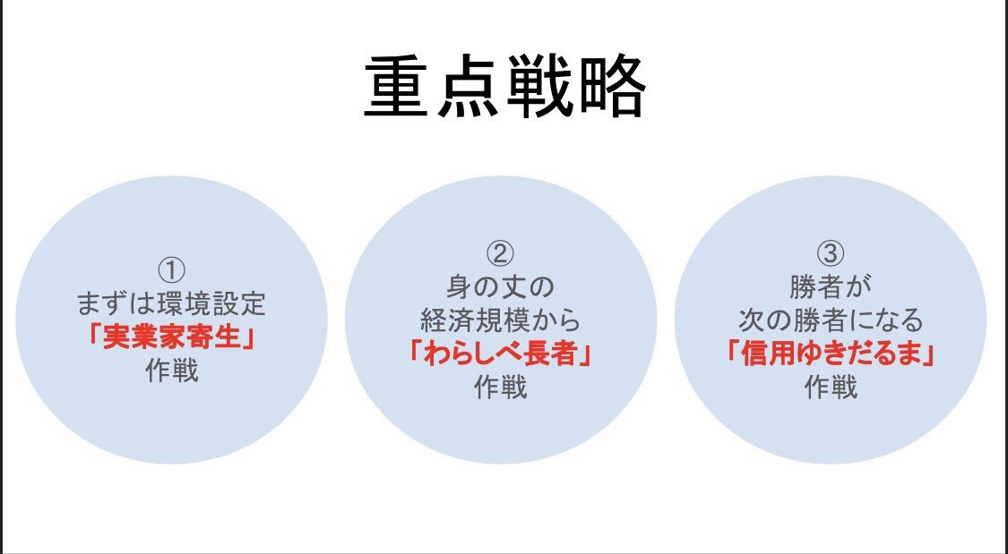 3つの重点戦略を紹介しました。1つ目の戦略はまず自身の環境設定を変え、実業家としてマインドセットを変更すること。環境から変化させてしまう実業家寄生作戦。
