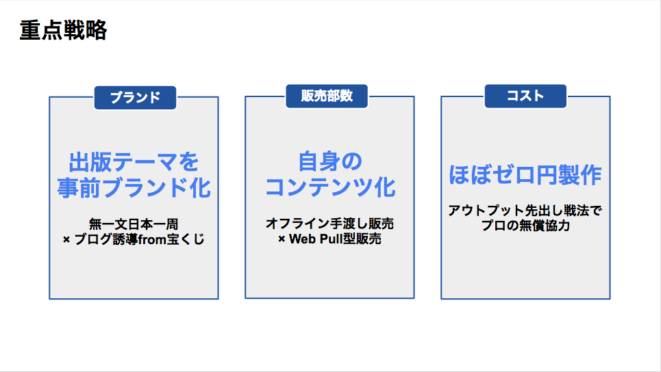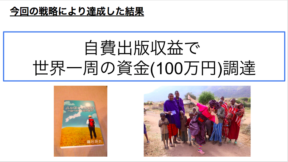 実際に藤谷がプレゼンした個人戦略の内容をシェアします。大学生(20歳)の時に自費出版の収益で世界一周の資金・100万円を集めたときの戦略です。