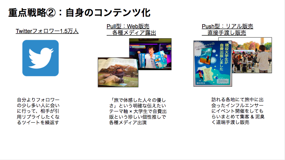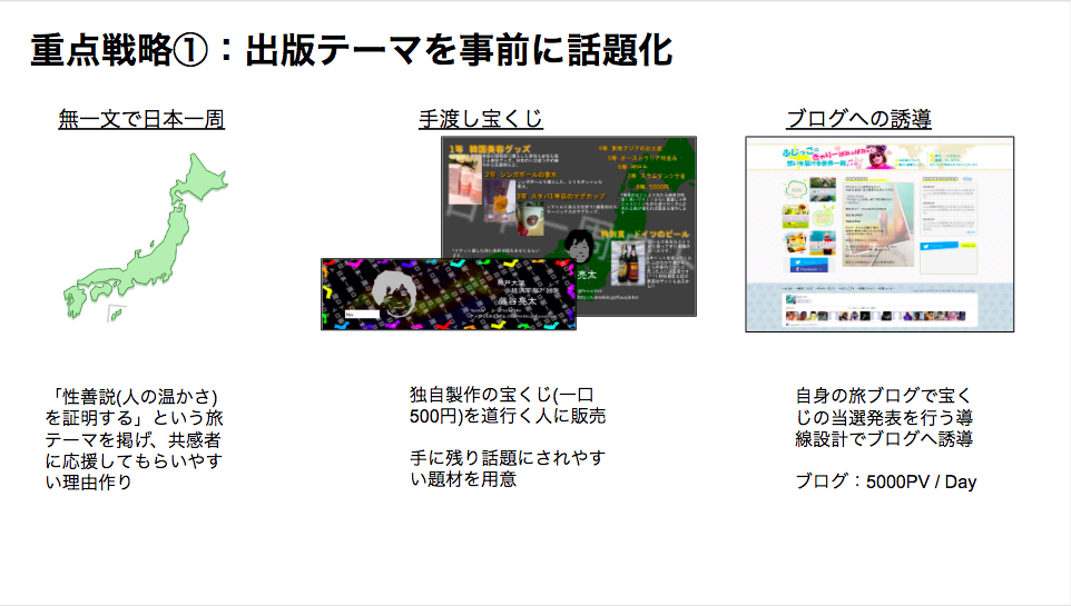 まず1つ目は、出版テーマを事前に話題化させるブランド戦略。いきなり無名の大学生が出版をしても買われないと思うので、出版テーマである日本一周の話自体にまずファンをつけた状態で出版しました。