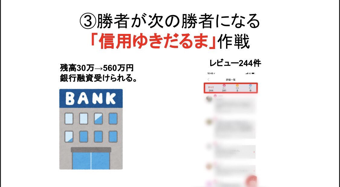 商品購入者からのレビューが信頼となり購入率が高まることが分かりました。商品は上位表示され「売れるものが売れる」正のスパイラル状態に。資金面では、口座預金が増えたことで融資を受けられることが分かり、採用面では、頑張っていることが人目に触れて協力者が現れたりとまるで「勝つスパイラル」に入ったかのように優位に物事が進み始めました。タビナカ創業者・三木と会ったのもこのときです。
