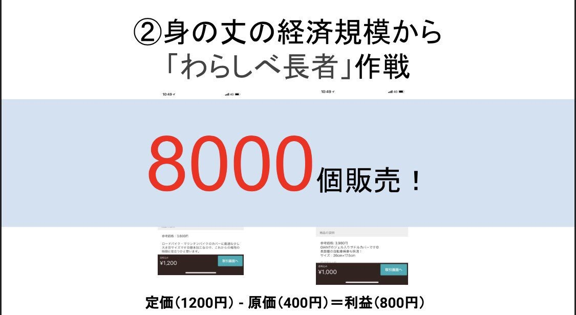 手触り感のある実働で、4ヶ月で自転車のサドルカバーを8000個販売しました!!一定自信がついたら勝負の規模を大きくし、25000円のモノを40000円で販売するような一工数あたりのインパクトに拘ることも始めました。