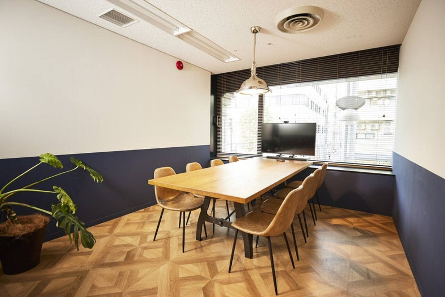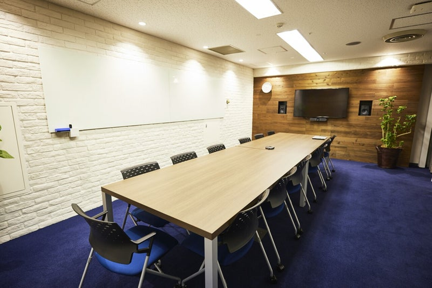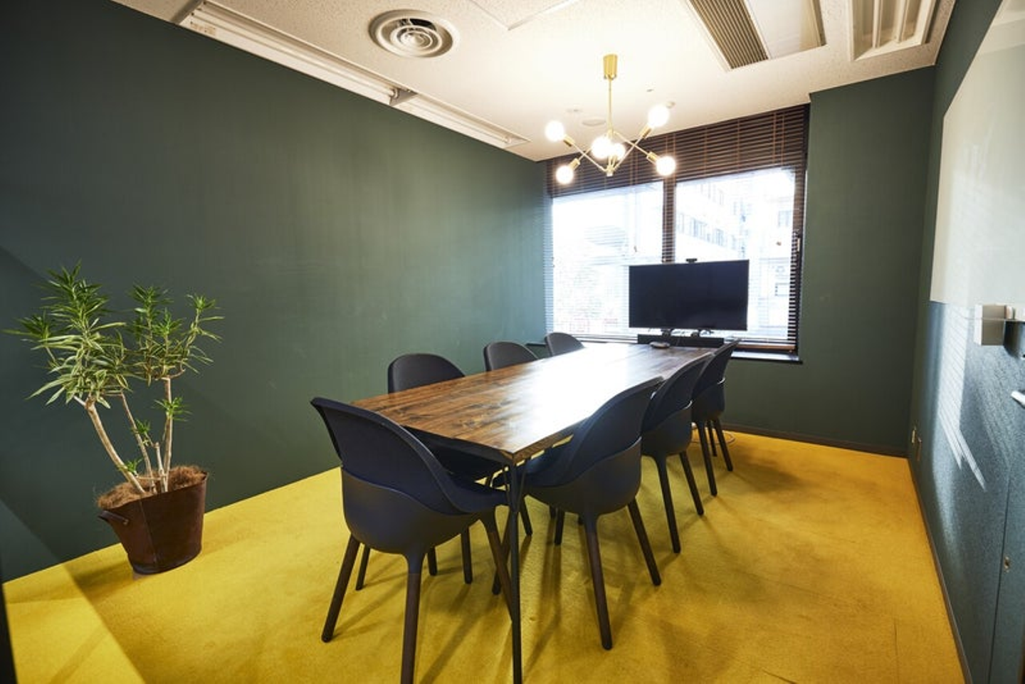 会議室Cは一番スタンダードな4~6人用の会議室です。ポイントはおしゃれな照明。壁の色は写真では分かりにくいけど緑の黒板っぽい色でこれまたおしゃれな仕上がりになっています。