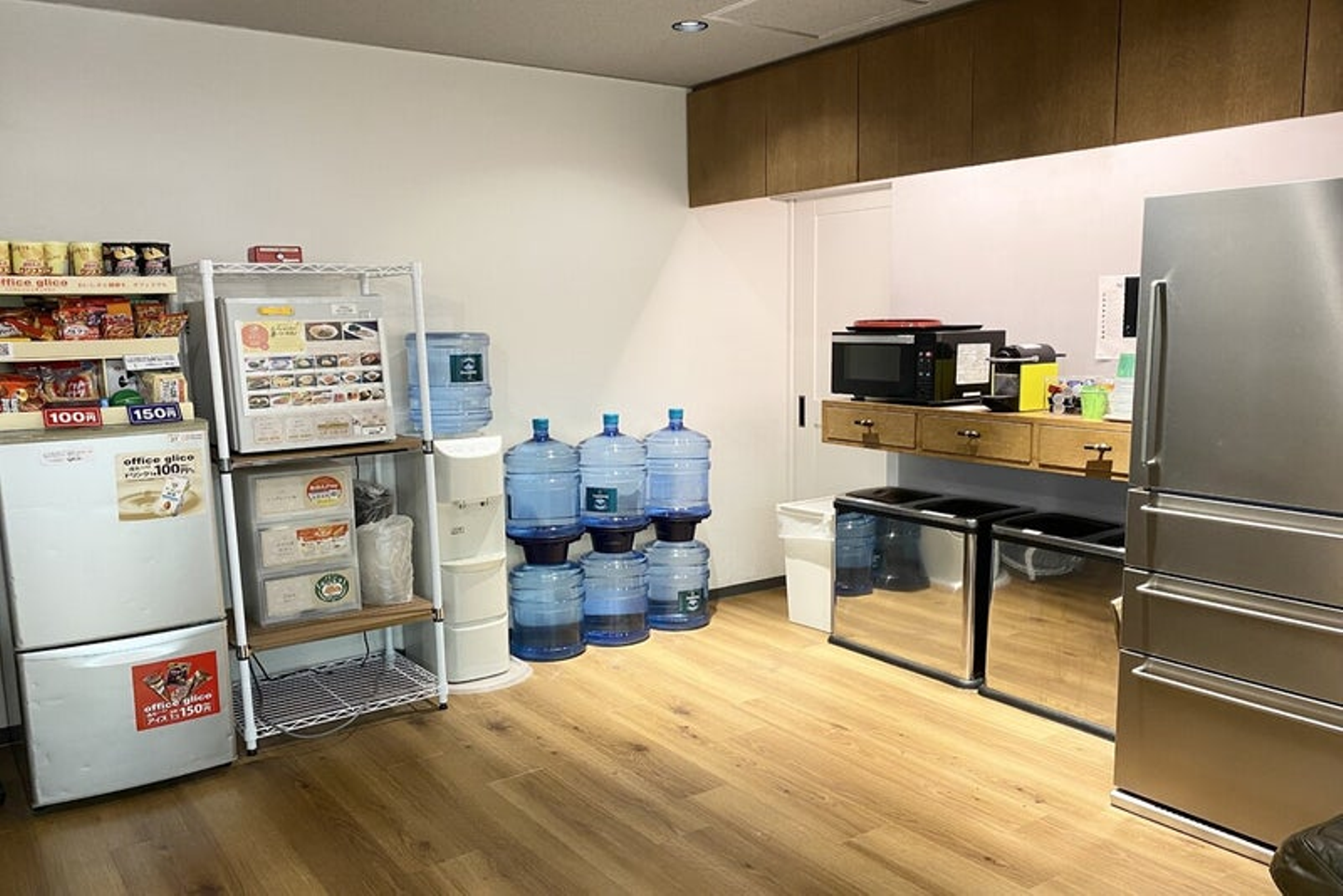 カフェスペース横にあるお水やお茶やネスプレッソ(コーヒー)は飲み放題。オフィスグリコ(100円くらいでおやつが買える)とオフィスおかん(100円でお惣菜が買える)も設置しているので、のどが渇いた時、お腹が減った時、わざわざ外に出なくても大丈夫!