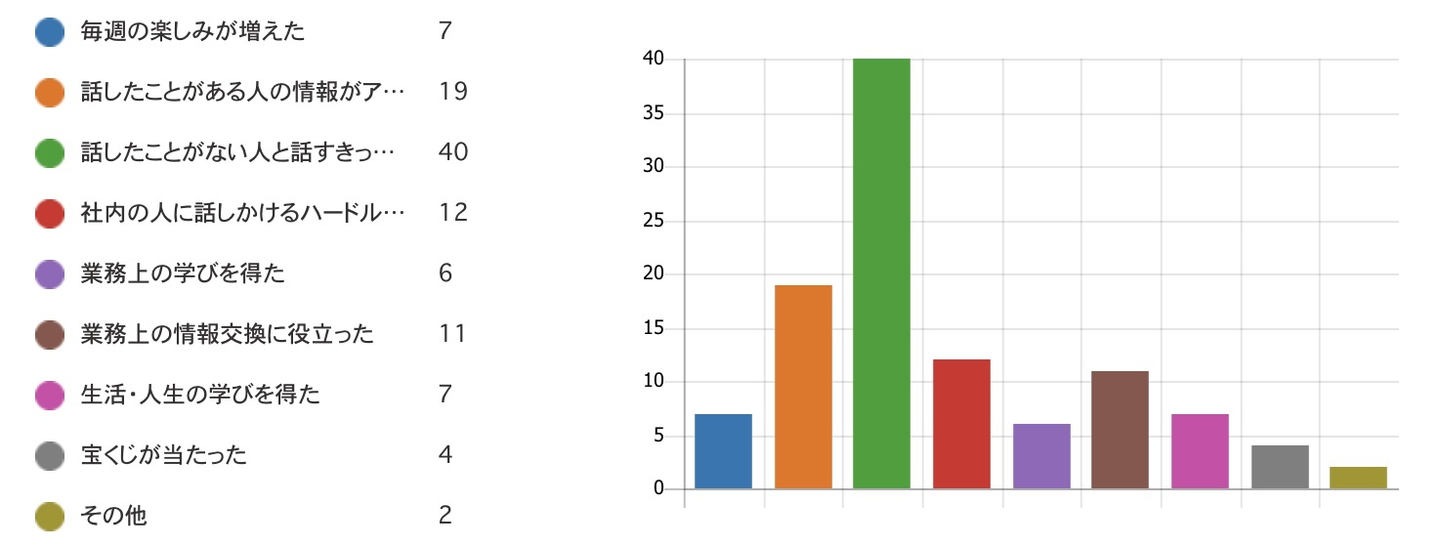 ほかにも、社内の人に話しかけるハードルが下がった、業務上の情報交換に役立った、