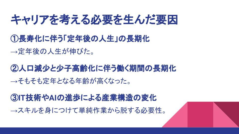 結論、これらが複合的に関連することで「就職→仕事→引退」という従来の型が時代遅れとなり、自らのスキルを磨いて長く活躍する重要性が高まったのです。
