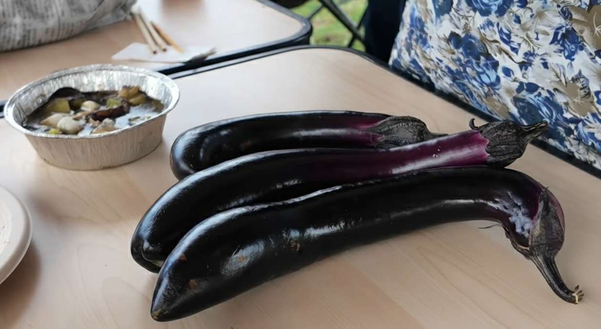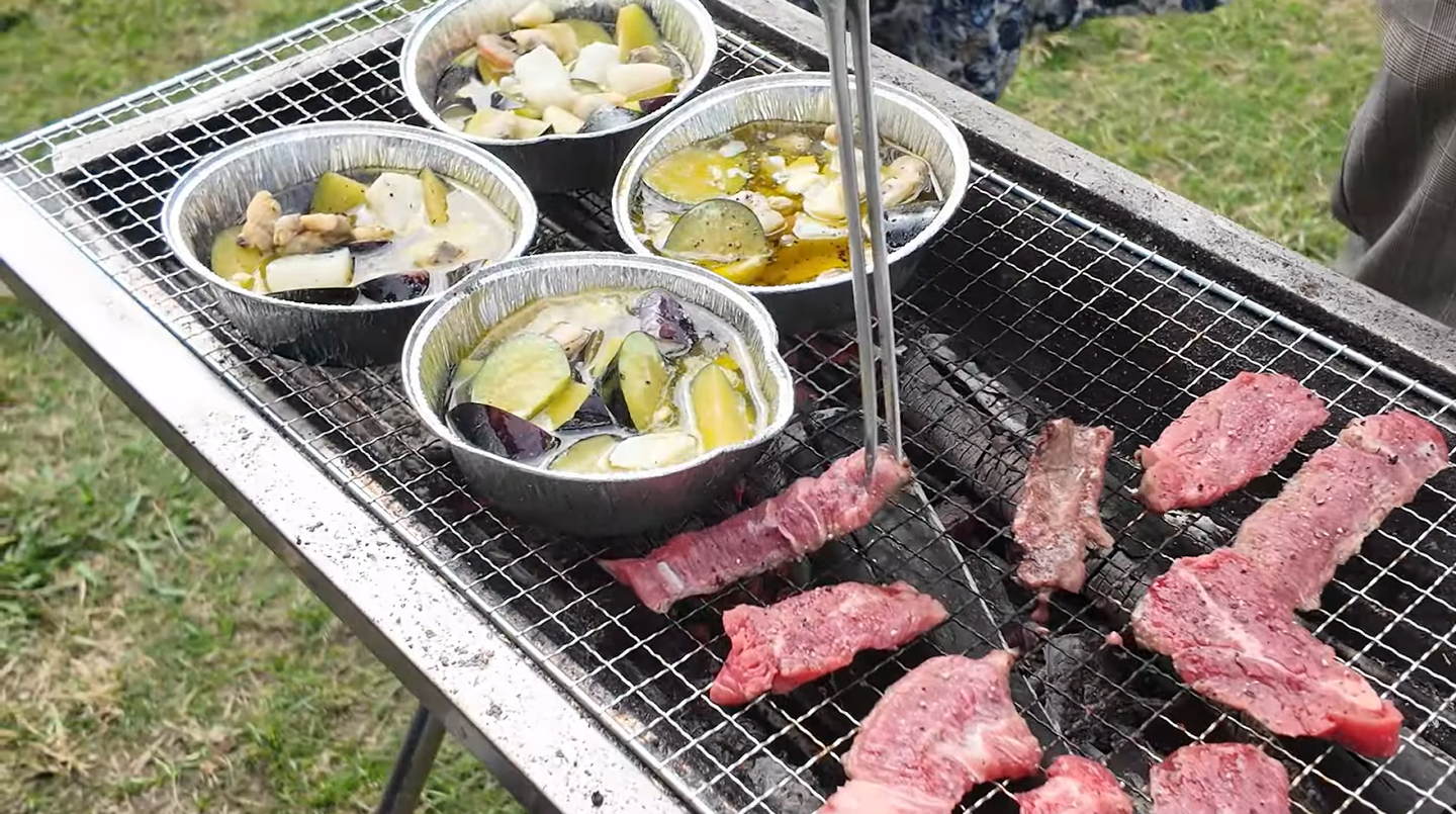 バーベキューに毎回参加されているYさんが、自宅農園で丹精込めて育てた立派な茄子やニンニクを持参。これを使い、その場でアヒージョを振る舞ってくれました。炭火でじっくり火を通した茄子のジューシーさと、オリーブオイルとニンニクの香りは絶品で、皆の食欲を刺激します。