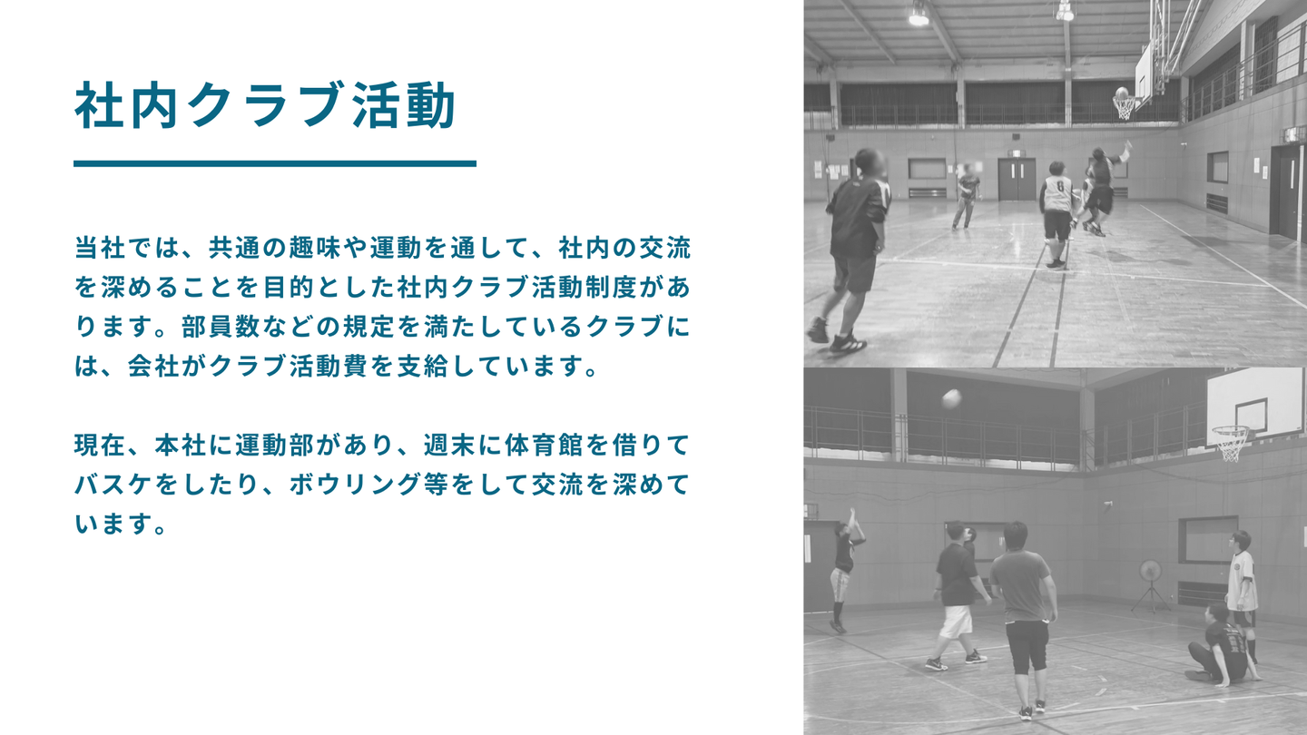 現在、本社に運動部があり、週末に体育館を借りてバスケをしたり、ボウリング等の球技を楽しみながら、交流を深めています。普段、デスクワークが多いため、運動する習慣が無い社員は、翌週、筋肉痛を感じながら仕事をしています。