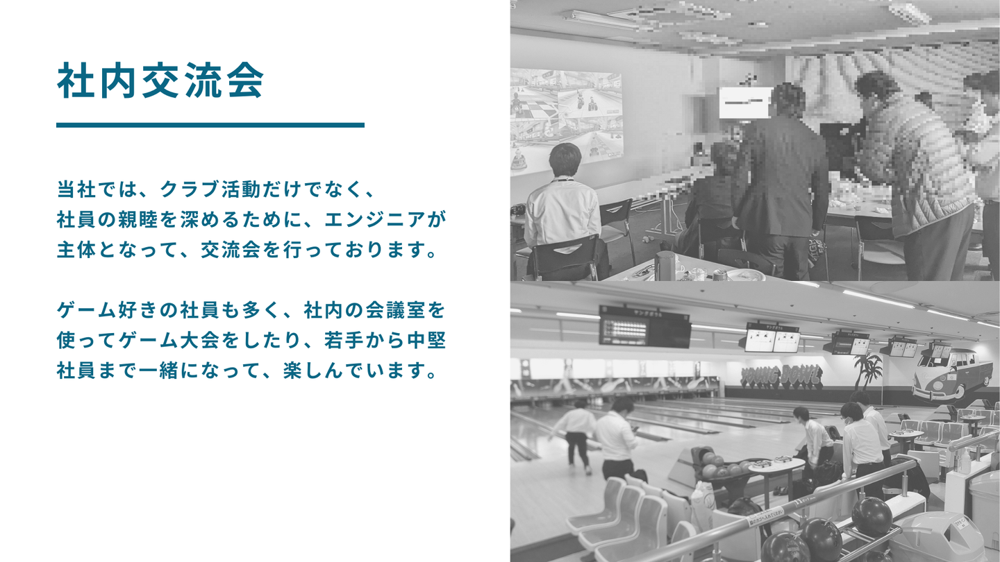 当社では、定期的に社内交流会を行っています。これまでの交流会では、ボウリングに行ったり、社内の会議室にゲーム機を持ち寄って、ゲーム大会を行いました。毎年、新入社員や中途社員が入社しているので、社内交流会は社員同士の親睦を深める良い機会になっております。