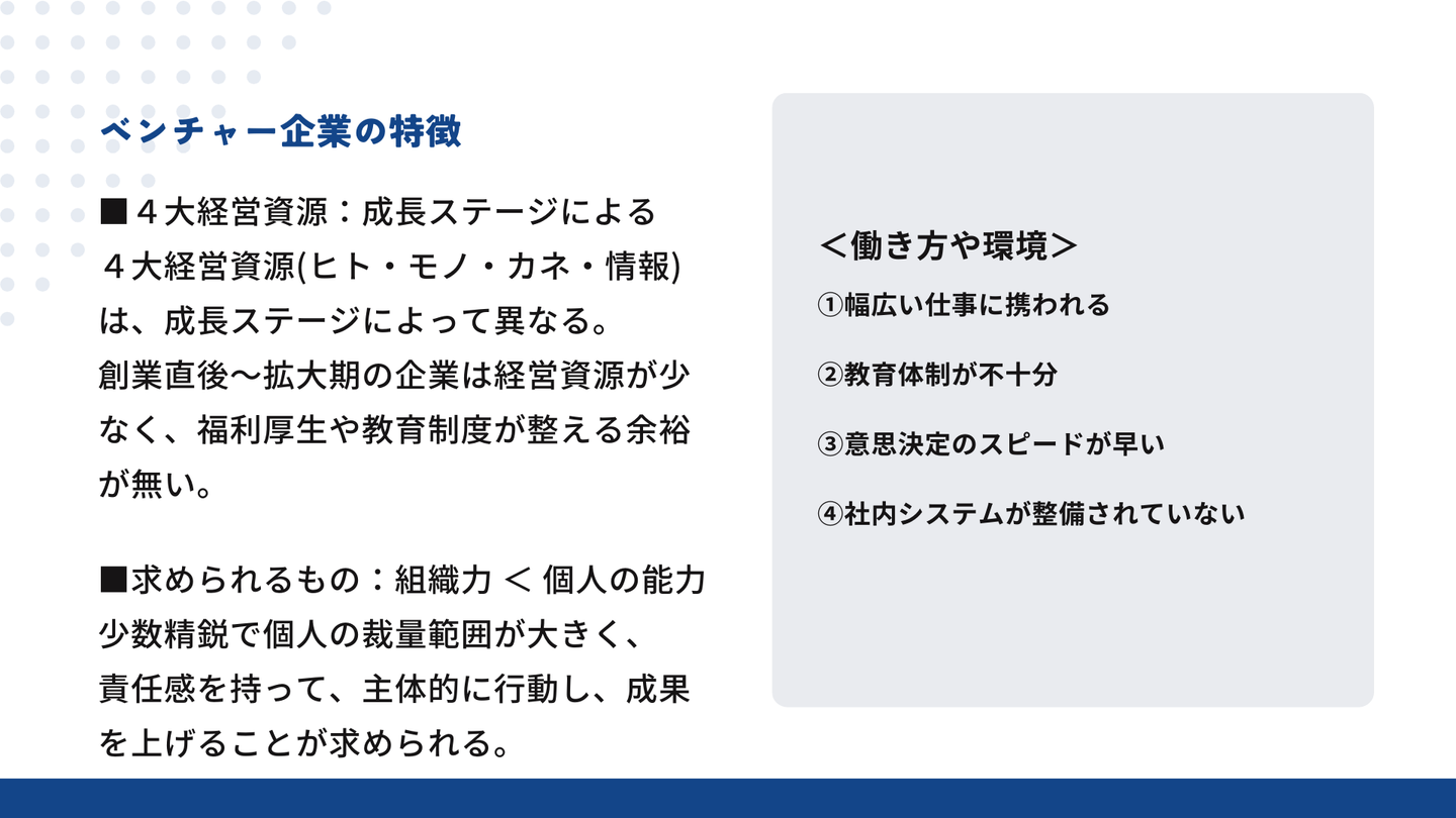 ベンチャー企業は中小企業よりも資金調達が難しいため、会社を成長させて事業を拡大し、安定させるためには、自分の業務以外にも興味を持ち、会社全体の仕事の流れやお金の流れを意識して、業務に取り組むことが重要です。