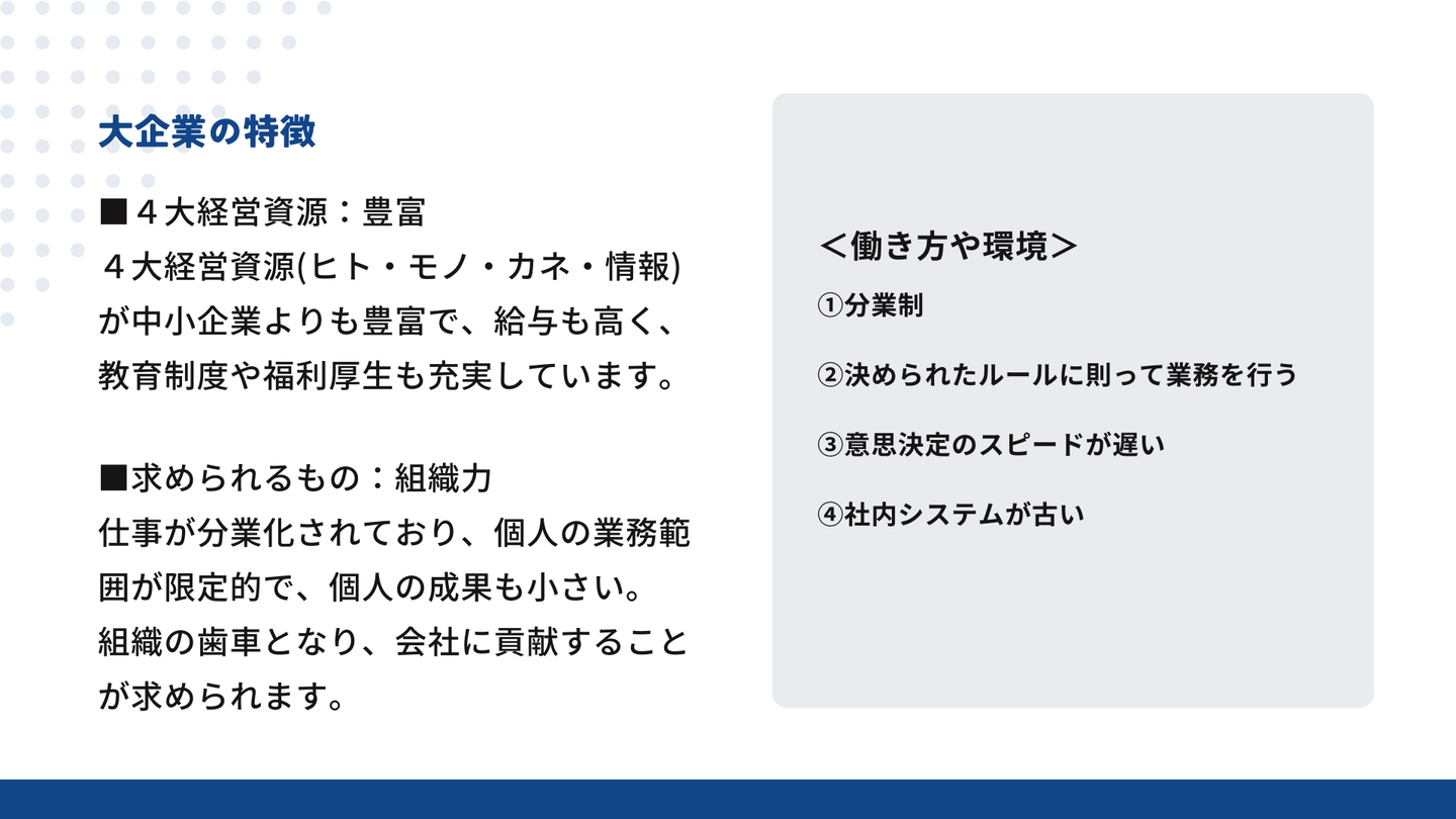大企業は中小企業と比較して、4大経営資源(ヒト・モノ・カネ・情報)が豊富で、教育制度や福利厚生も充実しています。