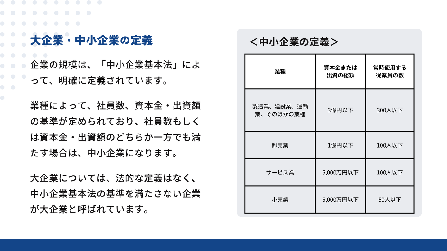 企業の規模は「中小企業基本法」によって定義されており、業種ごとに社員数・資本金・出資額について規定があります。一定の条件を満たしていると中小企業、基準を超えている場合は大企業と呼びます。