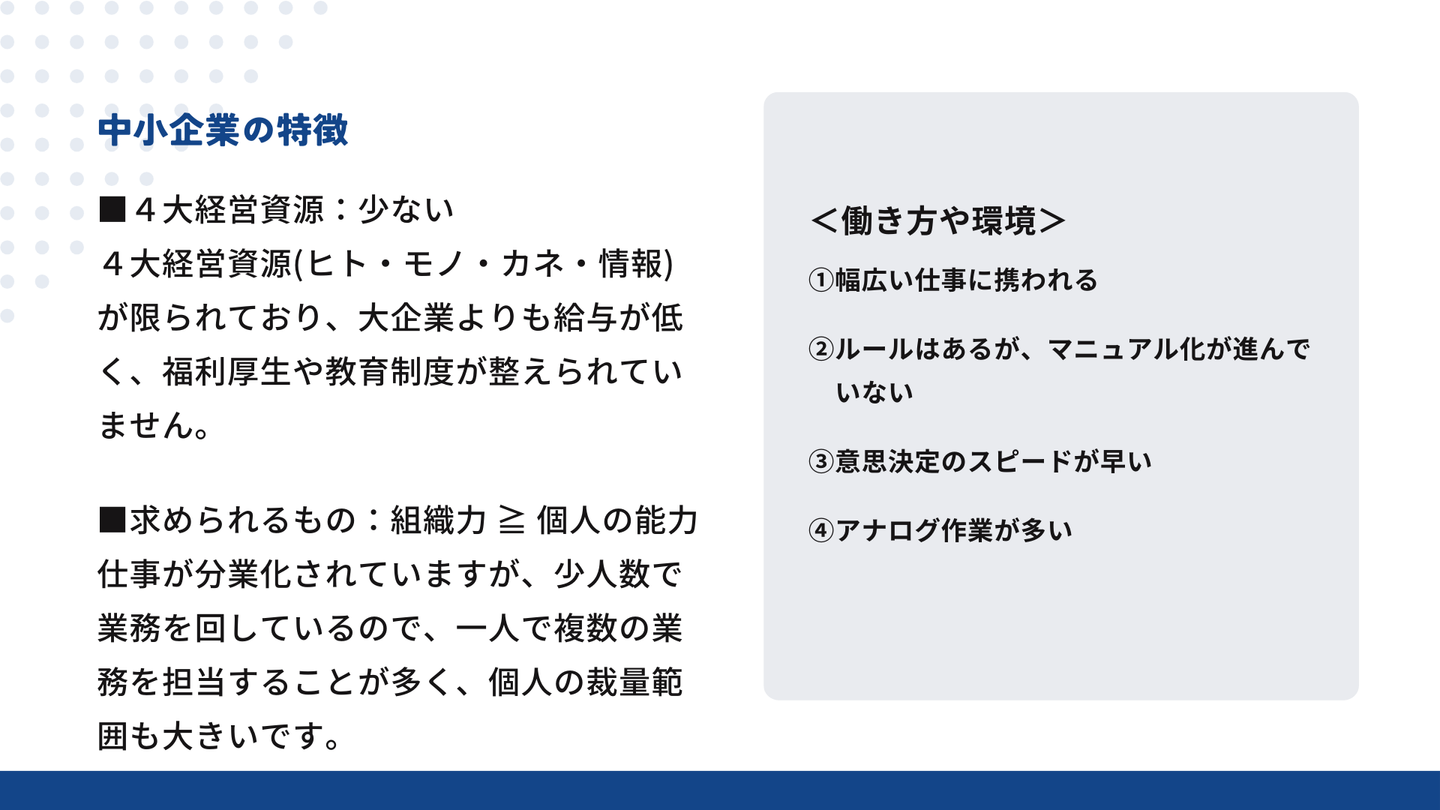 中小企業でも仕事が分業化されているものの、大企業に比べてリソースが少ないため、一人で複数の業務を担当することが多く、個人の裁量範囲も大きくなっています。