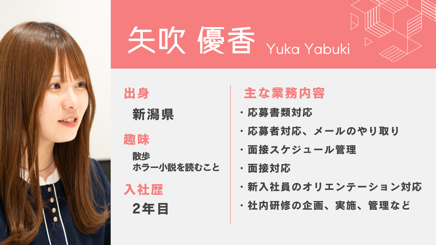 今回は、「採用教育室」のメンバーとして働く、矢吹にインタビューをしました!