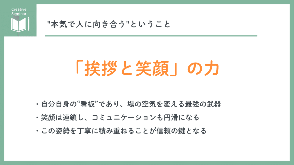 人と仕事をする以上、どれだけ技術のあるクリエイターであっても、挨拶や気配りといった基本的なコミュニケーションができなければ、信頼は築けません。