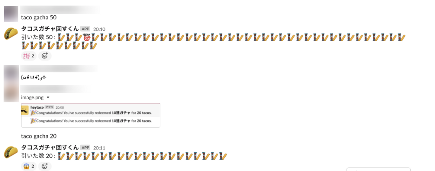 たとえば、感謝のメッセージを送るときに、その人にメンションを付けてタコスの絵文字を付けます。そうすると受け取ったタコスがSlack上で自動的にカウントされます。