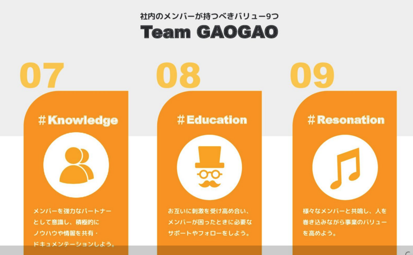 さらに、Visionを実現するために会社全体として掲げるValueとは別に、”GAOGAOに参画するメンバーが持つべき資質”という観点で9つのバリューを定めています。