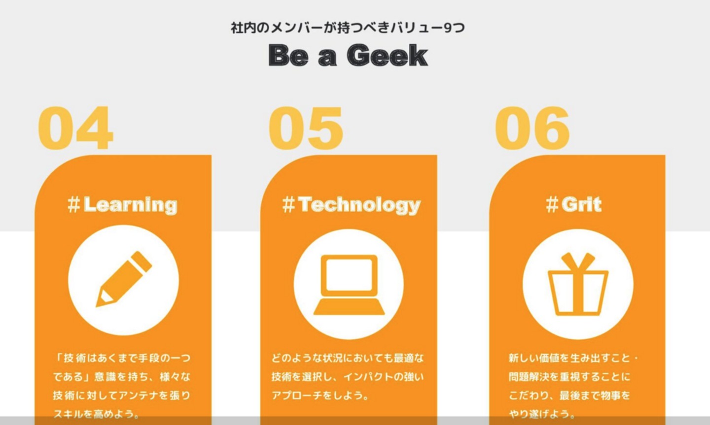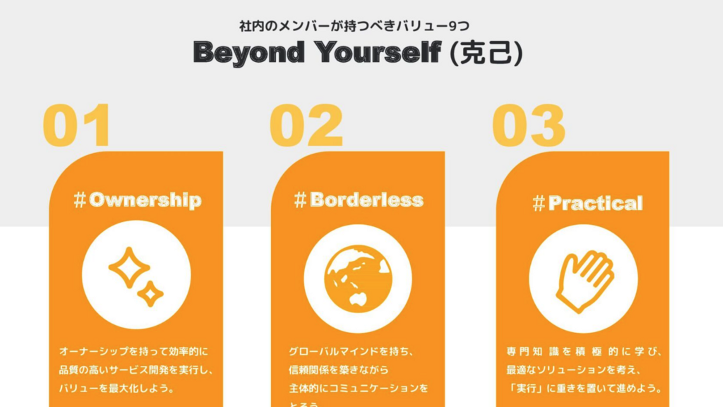 まず最初に、会社のバリューとして定めている3つの要素を含みます。