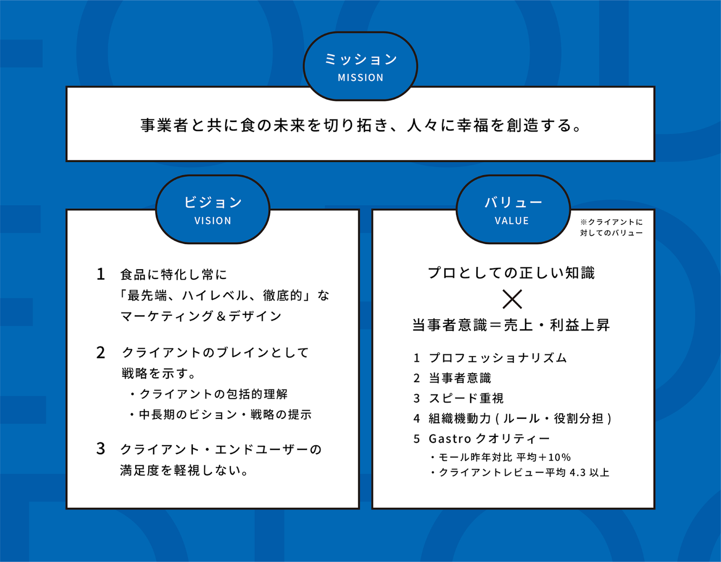 これまでも売上や受賞歴など、具体的な指標を目標として掲げていましたが、海外展開や自社物販など新しい挑戦を増やしている今、それだけでは捉えきれない価値も大きくなっています。そこで、より抽象度を上げた「最先端のマーケティングを武器に、事業者と共に食の未来を切り開く」という姿勢を明示し、本質的に目指すところを言語化しました。