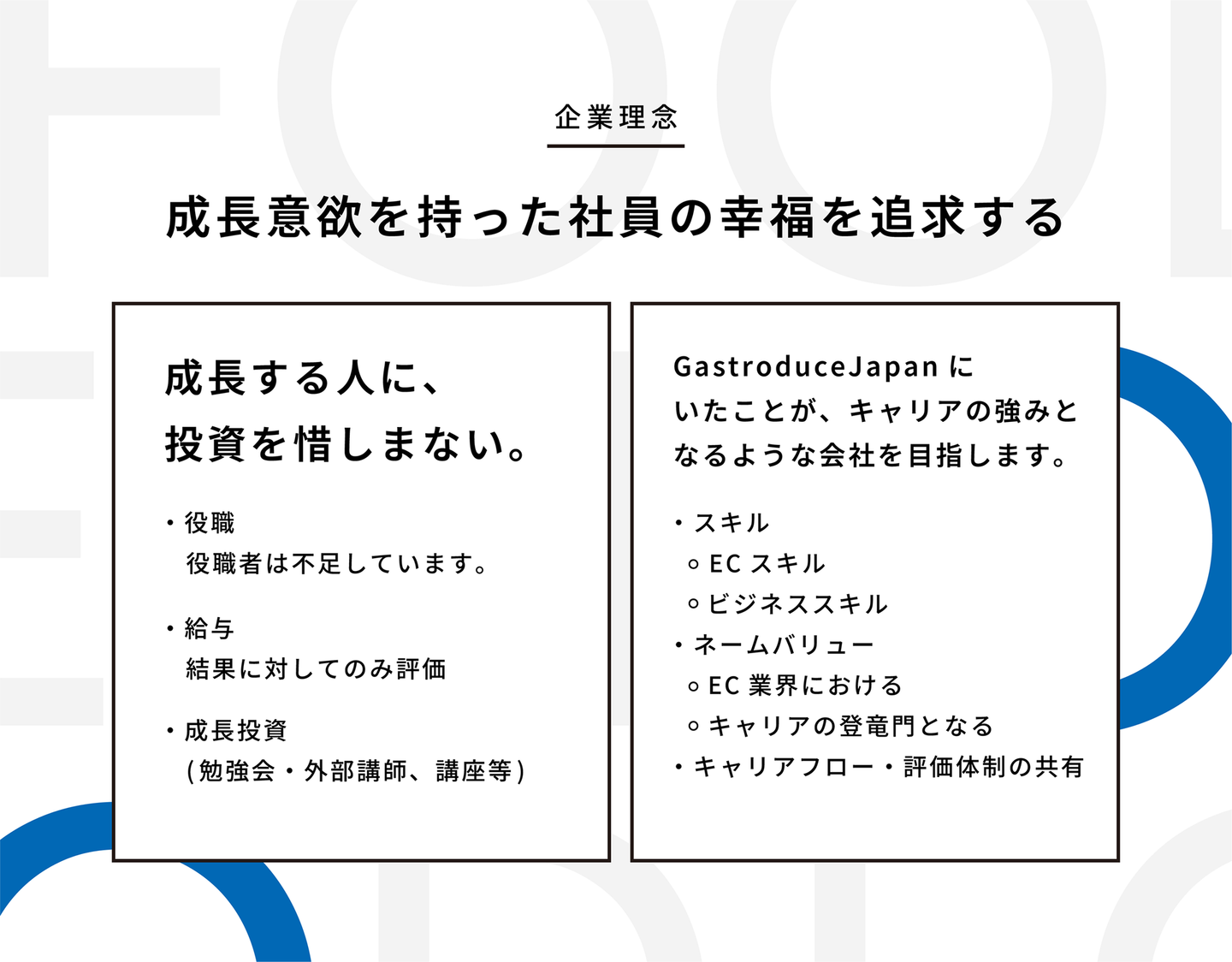 さらに、この企業理念を具体化するために「成長する人に投資を惜しまない」「Gastroduce Japanにいたことがキャリアの強みになる」という二つの要素を掲げました。社員それぞれが力を伸ばせるよう、学習環境や給与面、役職登用など、さまざまな面でサポート体制を整えているつもりです。
