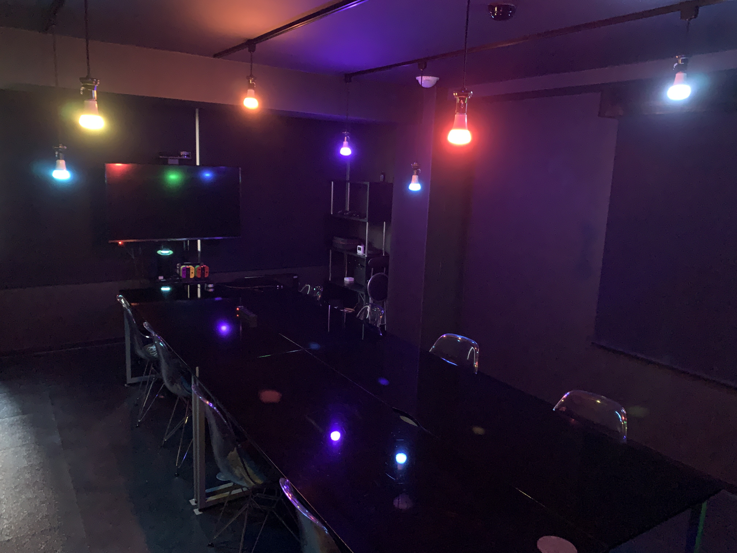 上の写真は会議室を使っていない時で、太陽系の惑星に合わせた照明で宇宙感を出しています!会議や社内勉強会ではもちろん明るめの照明をつけます。色もたくさん変えれるので、気分によって変更したりします!