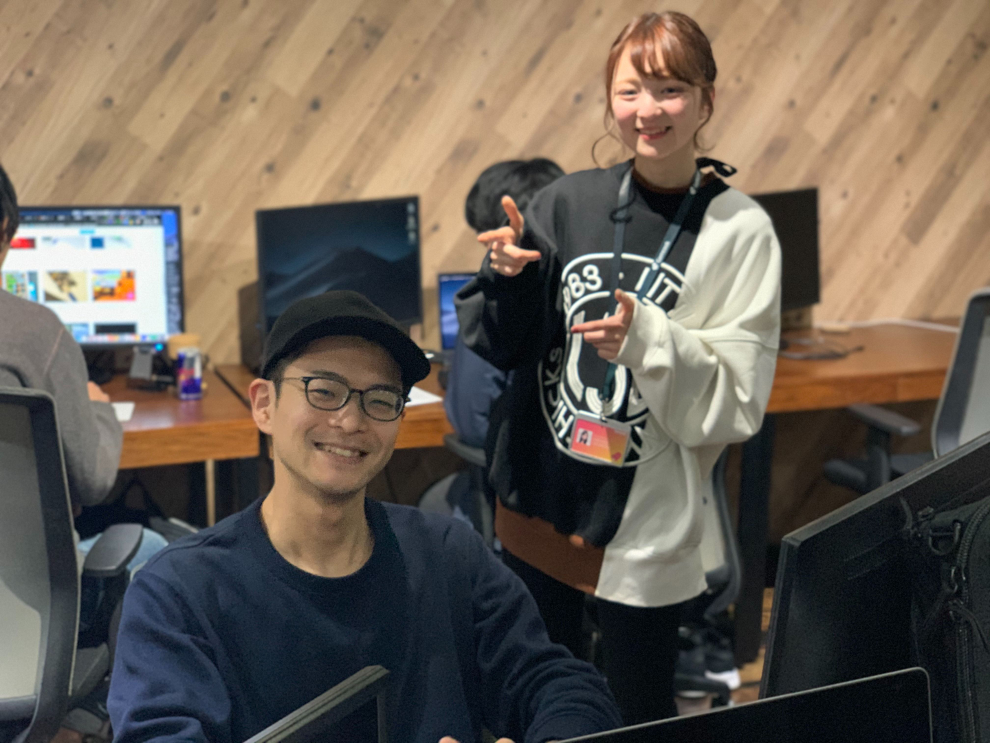 自分の席は決まっていますが、みんな自由に移動して話したり、ソファーで作業してたりと自由度があります。社内アプリを開発して将来的にこの天吊りモニターに表示させる予定ですが、アプリが出来るまではデザイナーが作ってくれた季節に合わせたスライドショーを表示しています!