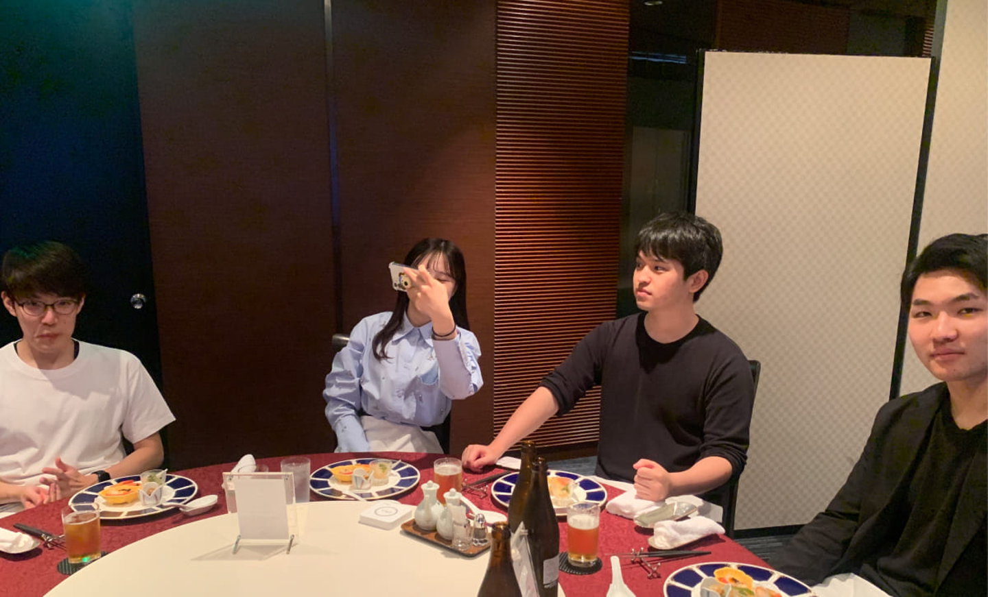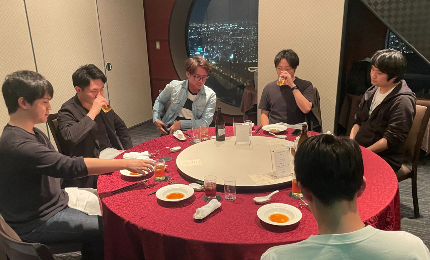 今回は、大阪オフィス近くにある中国料理のレストランで開催しました。地上39階からの夜景を眺めながらの食事は、いつも以上に会話が弾み箸も進みました。
