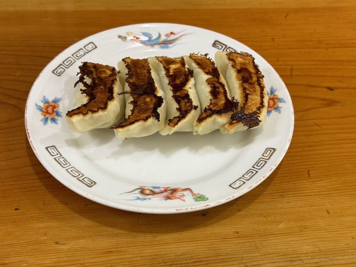 席に着いたらまず餃子です。1皿5枚 300円。いい感じです。