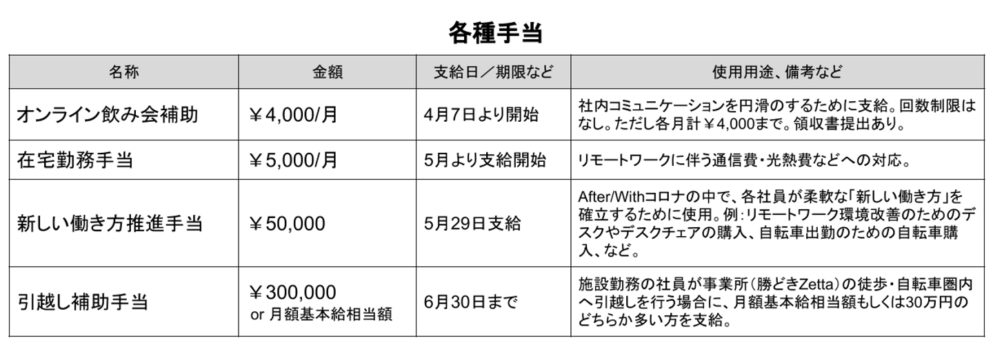 リモートワークと出社勤務を共存させることに加え、「新しい働き方促進手当(50,000円)」、「在宅勤務手当(5,000円/月)」、(事業所徒歩圏内への)「引越し補助手当(300,000円もしくは月額基本給相当額)」などの各種手当の支給、海外を含めた遠隔地からのリモートワーク体制の構築、業務のペーパーレス化の促進など、After/Withコロナを含めた長期的な視野に立ち、社員が安心・安全な環境で、より生産性高く豊かな働き方ができるよう、設備面・制度面の改善を進めて参ります。
