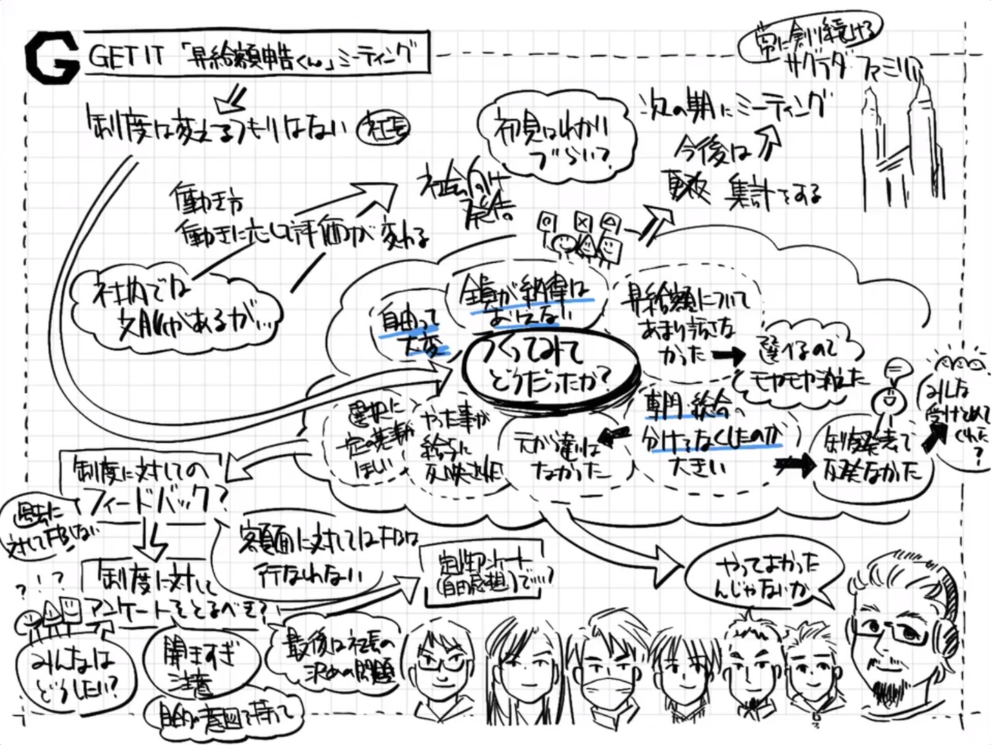 ▲昇給制度検討プロジェクト:ミーティング内容のグラフィックレコーディング(グラフィックレコーディング作成 ©️本園大介,2020)