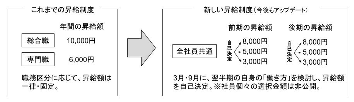 従来、年1回、職務区分によって一律に決まっていた昇給(総合職:10,000円、専門職:6,000円)を、職務区分を廃して全社員共通とした上で、3月と9月の年2回、3つの選択肢(8,000円、5,000円、3,000円)の中から昇給額を自己決定する方式に変更いたしました。各社員が翌半期に向けて自身の「働き方」を検討して決定した昇給額は、「昇給額申告くん」(※昇給額を自己申告するための社内システム)により申請することで、以降の給与に反映されます。