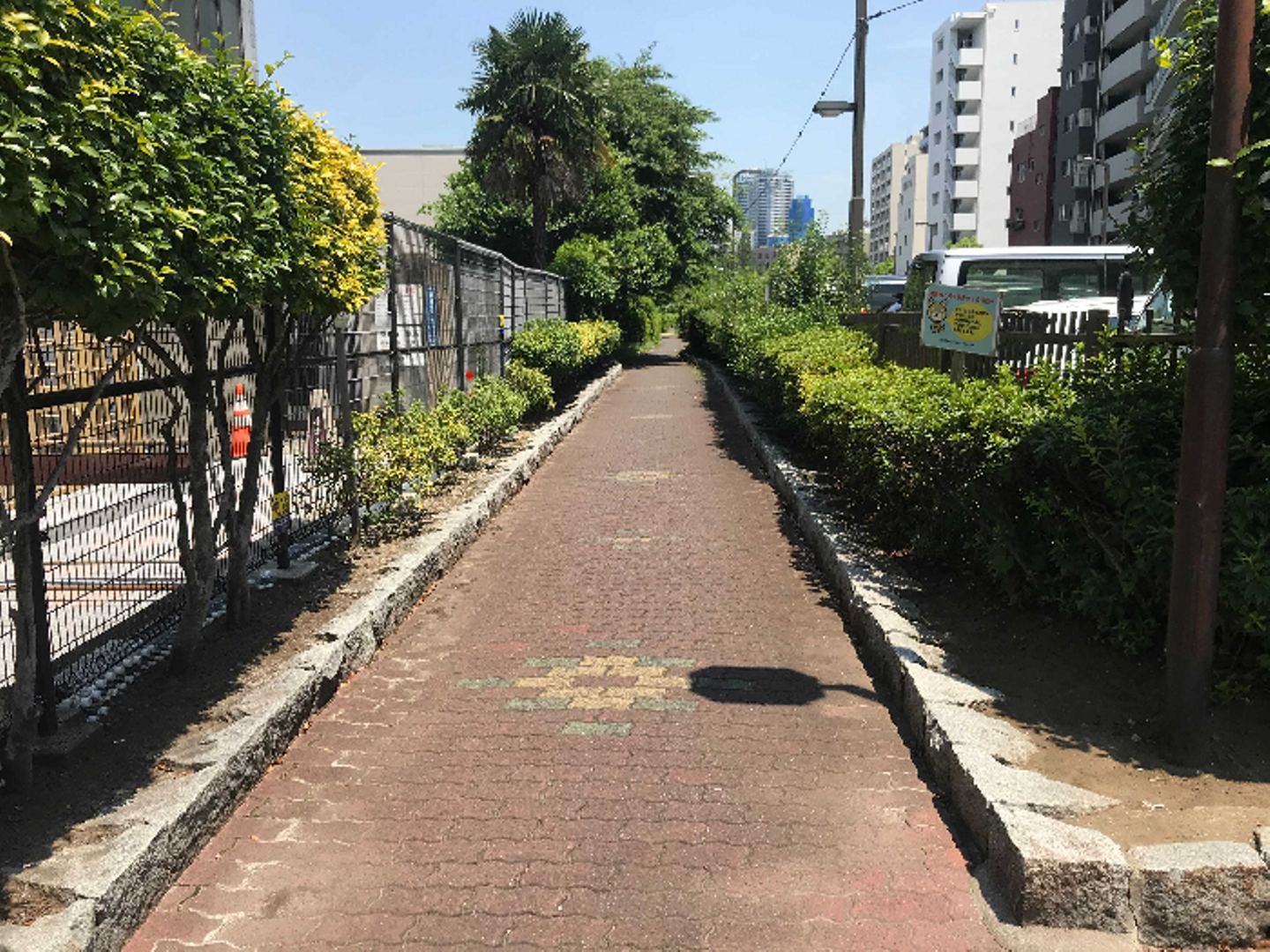 晴海通りから築地本願寺の裏を通って、中央区立築地川公園に続く緑道です。