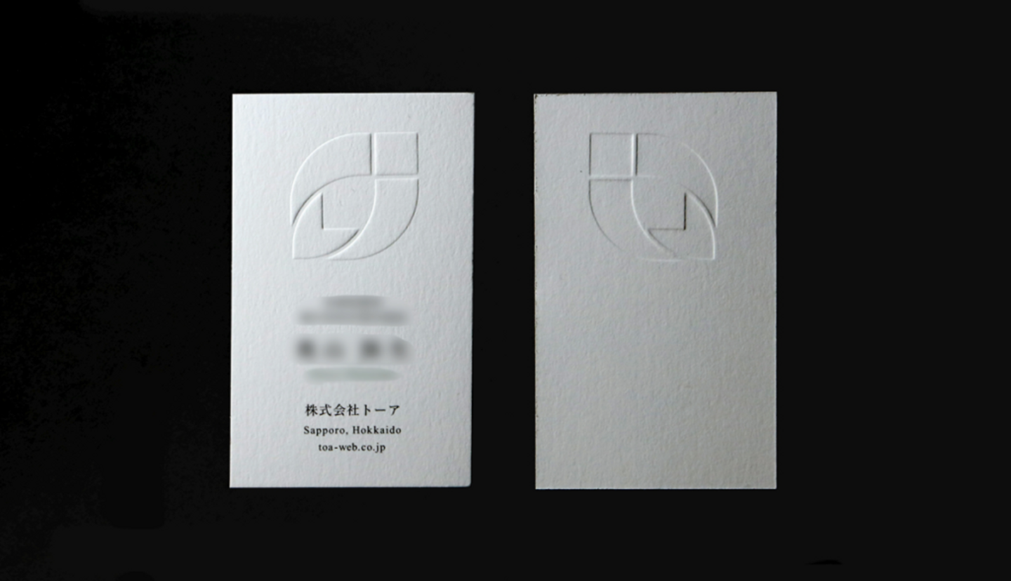 株式会社トーア様の名刺をデザインしました。掲載情報は用途に合わせて大胆に削ぎ落とし、余白設計・紙の質感・エンボス加工の存在感で魅せる構成に。リニューアルしたロゴは、あえて色を使わずエンボス加工のみで立体的に表現。光の角度で浮かび上がるディテールが、上質さと静かな個性を際立たせます。保険代理店としての信頼感と、モダンな印象を両立しています。