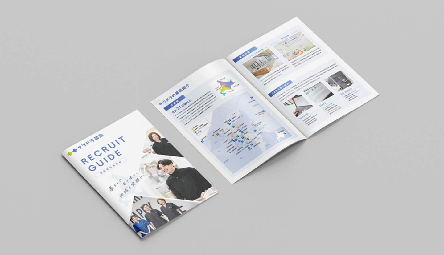 株式会社サッポロドラッグストアー様が採用活動で使用される薬剤師採用向けのパンフレットリニューアルを担当しました。従来のパンフレットはB5横サイズだったのですが、一般的に馴染みのあるサイズで情報を伝えたいという想いや、掲載したい情報のボリュームなども考慮しA4縦サイズに刷新しております。