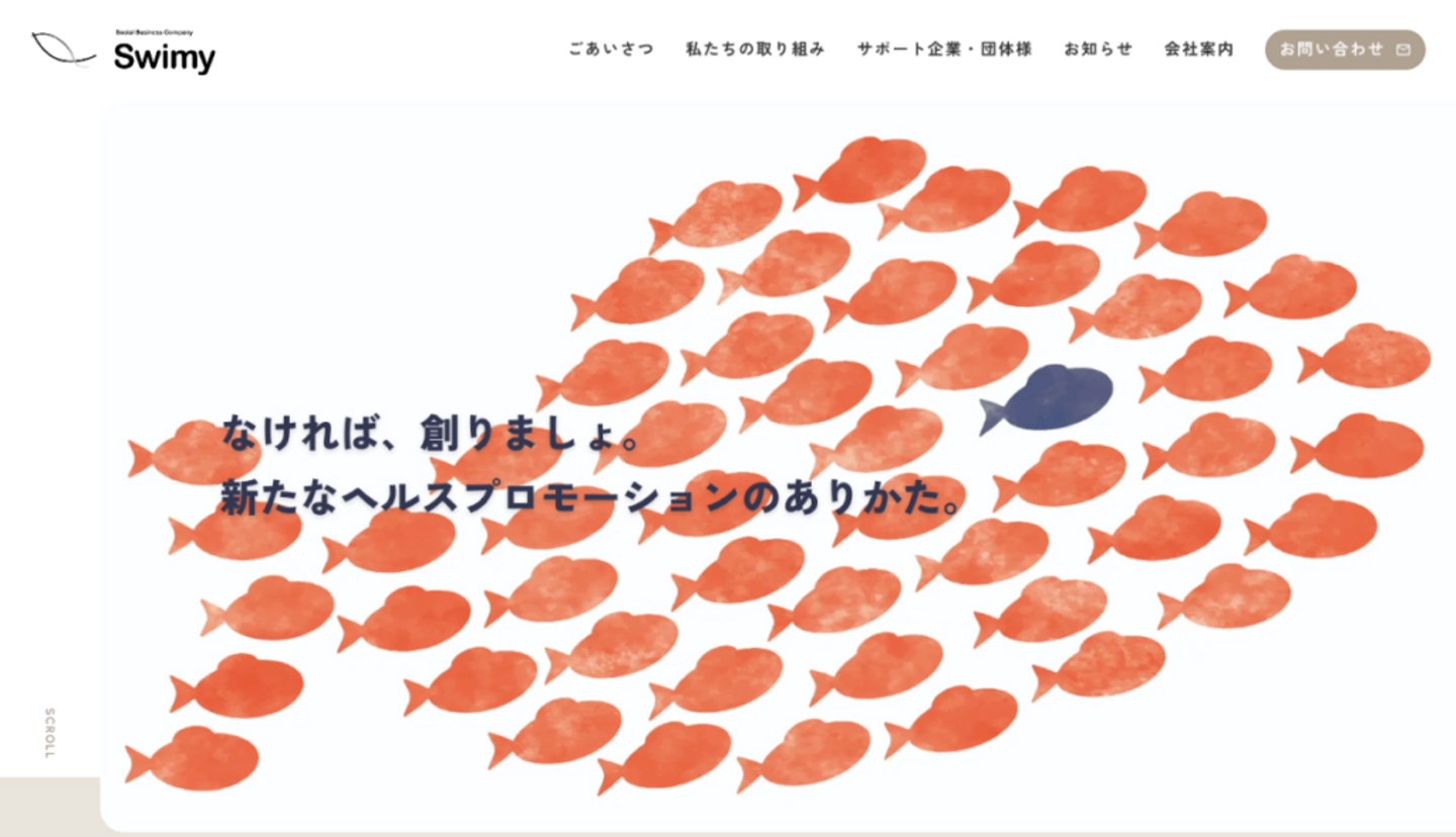 会社名である「Swimy(スイミー)」に込められた、「一人一人の力を合わせ、地域の皆さんと支え合いながら、温かな社会づくりを進めていきたい」というメッセージが素晴らしかったため、連想させるビジュアルにメインに採用し反映させております。