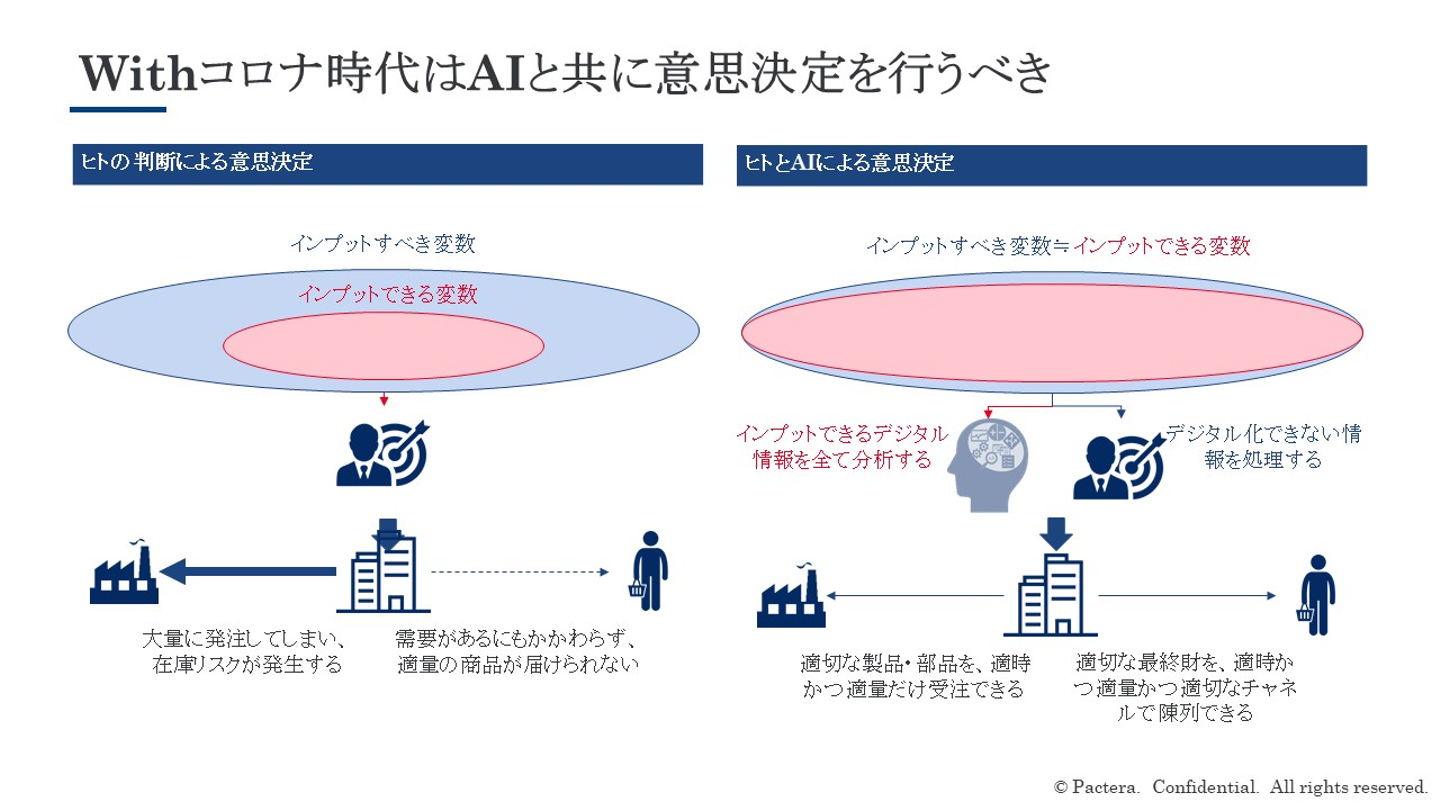 消費者行動の急速かつ予測付不可能な変化に対応するにはヒトの判断による意思決定では困難であり、テクノロジーを活用した最適な意思決定が必要となります。従来のマンパワーによるインプットでは限界があるため、AIを用いて網羅的にデータの収集・分析を行い、顧客・サプライヤーの動向を正確に予測することで機会損失や過剰反応を防ぐのです。