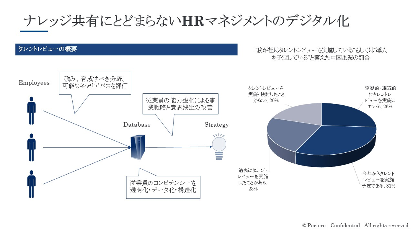 様々なソフトウェアツールの開発・導入によって、従業員間コミュニケーションやナレッジ共有が促進されていますが、中国では既に「タレントレビュー」という概念が一般化しつつあり、人事評価や人事異動にもデジタルツールの導入されています。