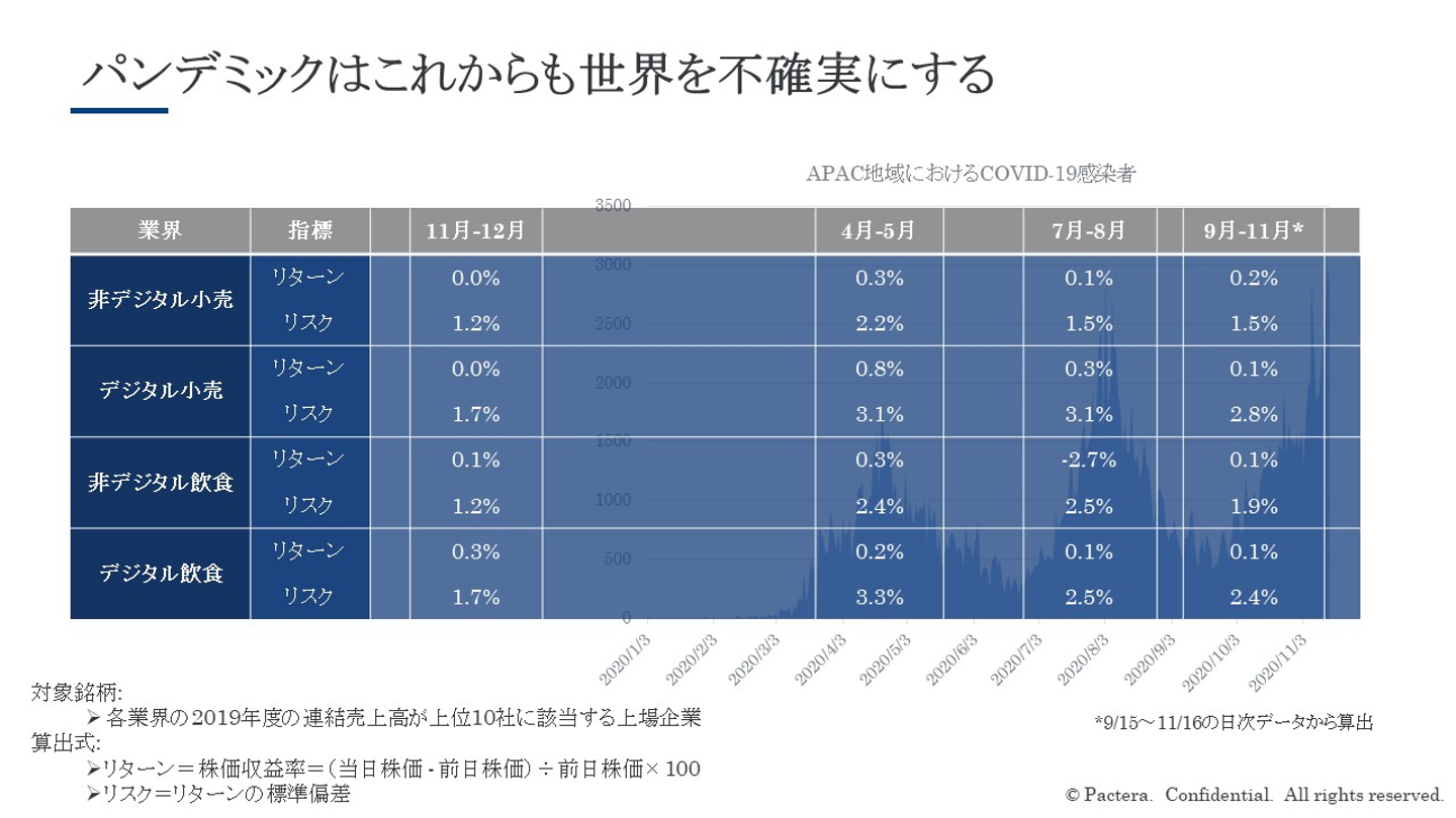 今回のパンデミックはこれからも世界を不確実にするようです。小売・飲食業界の投資市場の動向をみると、株式リターンとボラティリティは低下傾向にあるが、パンデミック以前と比べるとまだ不透明さが垣間見られます。
