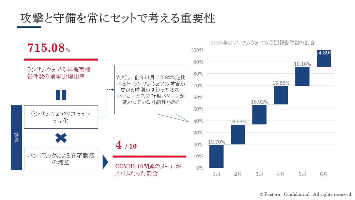 企業のブランディングや信頼を維持し続けるためにリスクマネジメントにも目を向けることが必要です。ランサムウェアのコモディティ化と在宅勤務増加が相まっての前年比増加率は700%を超えており、ハッカーの行動パターンも変化することあり得る、攻撃と守備をセットで考えなければなりません。