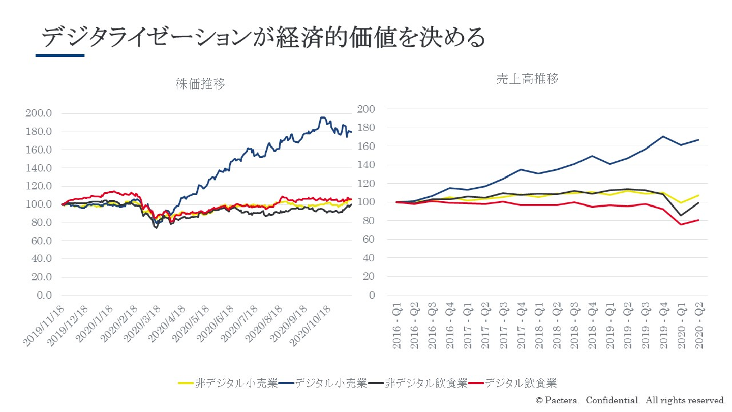 株価・売上推移のグラフを見ると、特に小売業界ではデジタルサプライヤーのプレゼンスが相対的に向上していることが分かります。巣ごもり消費やEC市場が拡大し、企業もマーケットの動向に対応していったことが要因として考えられます。
