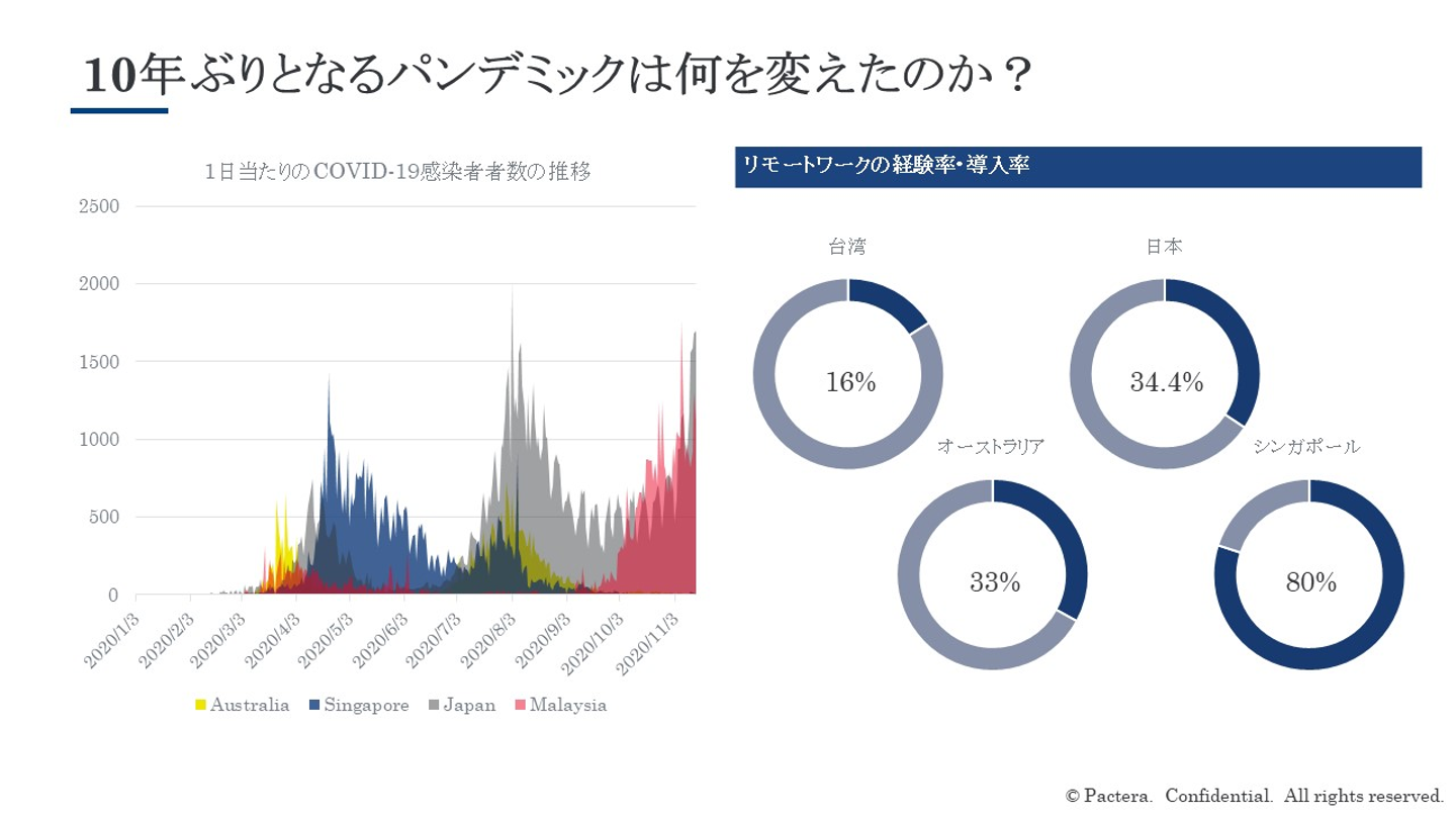 非対面での生活様式に移行し、非接触型ワークスタイルが増加しました。今まで対面での働き方が中心であった日本や台湾も感染拡大により、今ではリモートワークが当たり前になりつつあります。